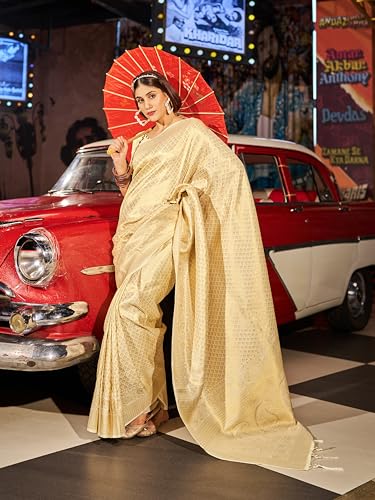 SIRIL Women's Cotton Printed Zari Stripe Ready To Wear One Minute Pleated Saree With Unstitched Blouse Piece