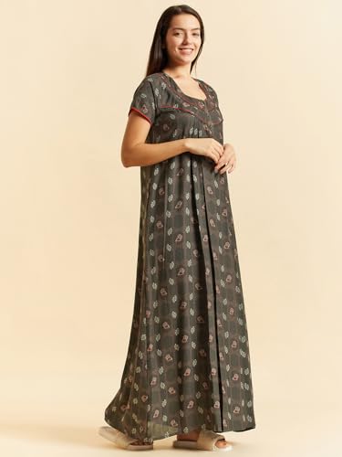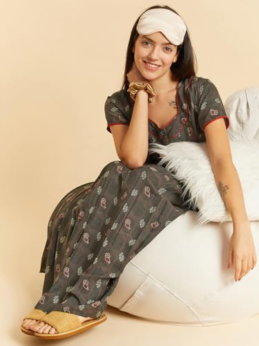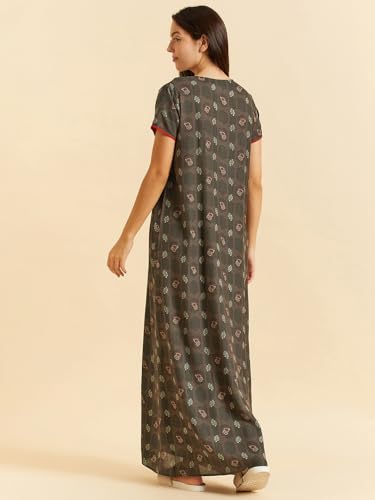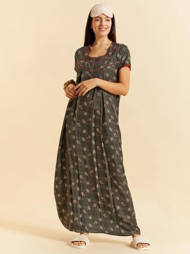 kasya Green Floral Cotton Nightgown with Lace | Cotton Nighty for Women with Pockets | Premium Flower Printed Nightgown | Comfortable Maxi Dress/Sleepwear/Nightwear